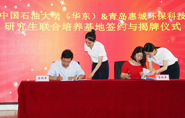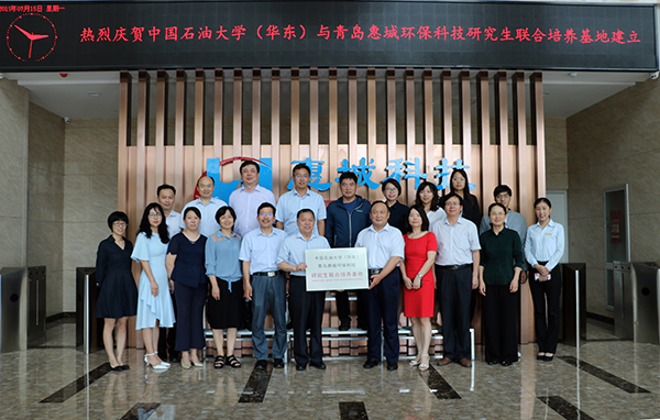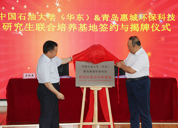 7月15日下午,“中國石油大學(華東)與青島惠城環??萍佳芯可摵吓囵B基地”揭牌儀式在公司研發中心隆重舉行,中國石油大學(華東)副校長、研究生院院長李兆敏,研究生院常務副院長閻子峰及學校其他領導、老師,我公司董事長張新功、常務副總經理葉紅攜公司核心技術人員及入學石大的學生代表共同出席了此次揭牌儀式。