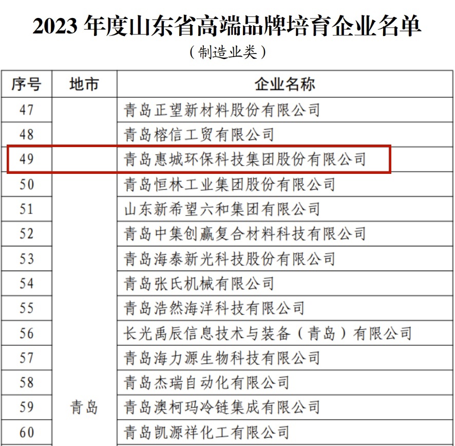 日前,山東省市場(chǎng)監(jiān)督管理局公布了“2023年度山東省高端品牌培育企業(yè)”名單,青島惠城環(huán)?萍技瘓F(tuán)股份有限公司榜上有名。