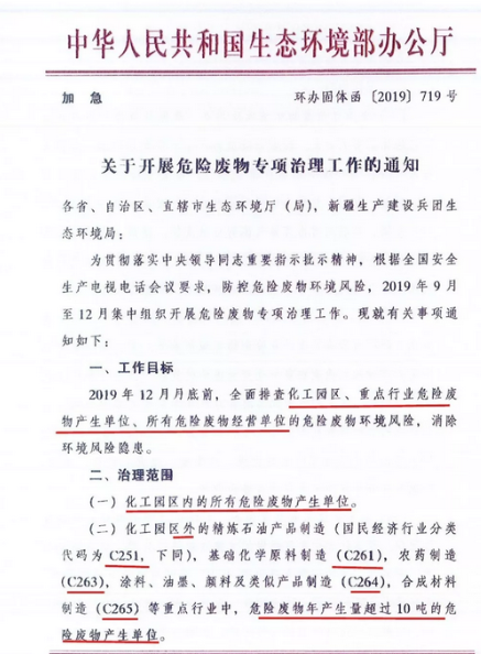 日前生態(tài)環(huán)境部印發(fā)加急文件《關(guān)于開展危險廢物專項(xiàng)治理工作的通知》。